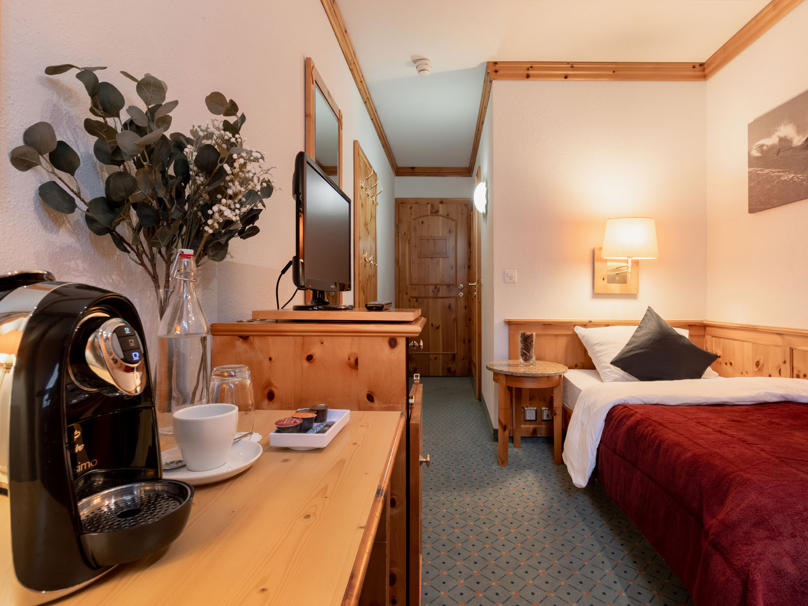 Das Zimmer verfügt zusätzlich über einen Safe, eine Minibar, Kaffeemaschine, zentral